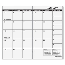 Monthly appointment book refill is designed for use with At-A-Glance 70-064 monthly planners. Dated planning pages range 13 months from January to January. Two-page-per-month spreads offer unruled daily blocks, Monday-through-Sunday scheduling, holidays and past and future months reference. Refill also offers a stapled binding.