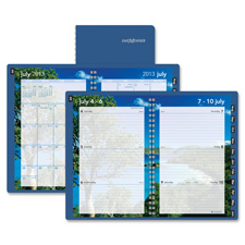 Professional weekly/monthly planner offers a different tropical background every month and academic planning format. Planning pages range 12 months from July to June. Two-page-per-week spreads include ruled daily entries and Monday through Sunday scheduling. Tabbed two-page-per-month spreads feature unruled daily blocks, holidays, Sunday through Saturday scheduling, ruled column for notes, and past and future months reference. Wirebound planner also offers Julian dates, telephone/address and notes sections and quality paper made of 30 percent post-consumer material.
