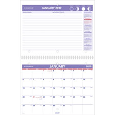 Monthly desk/wall calendar will help keep you up-to-date all year long. Dated planning pages range 12 months from January to December. Two-page-per-month spreads feature nearly a full page of ruled, QuickNotes writing area along with the phases of the moon, and one past, current and four future months reference. The other page includes a monthly calendar with unruled daily blocks (1-1/2" x 1-1/4"), count of days/days remaining, Sunday-through-Saturday scheduling, and federal holidays highlighted in red. Wirebound calendar has a bonus page for notes and future planning and is three-hole punched for binder use.