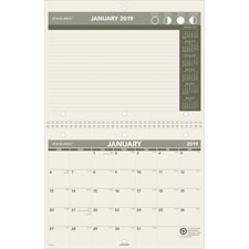 Monthly desk/wall calendar is environmentally friendly with tips for "Green Living" featured each month and a high recycled content. Dated planning pages range 12 months from January to December. Two-page-per-month spreads feature nearly a full page of ruled, QuickNotes writing area along with the phases of the moon, and one past, current and four future months reference. The other page includes a monthly calendar with unruled daily blocks (1-1/2" x 1-1/4"), count of days/days remaining, Sunday-through-Saturday scheduling, and holidays. Wirebound calendar has a bonus page for notes and future planning and is three-hole punched for binder use.