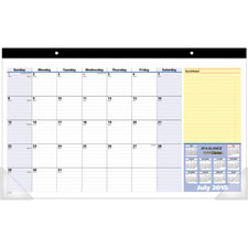 Compact desk pad offers a special yellow QuickNotes area for notes and the perfect size for small work spaces. Dated planning pages range 13 months from July to July. One-page-per-month format includes a QuickNotes writing section, ruled daily blocks (1-5/8" x 1-1/1"), Sunday-to-Saturday scheduling, shaded weekends, count of days/days remaining, federal holidays in red and one past, current and eight future months reference. The current month is highlighted with a red box. Calendar pages are printed in blue, red and yellow ink on recycled paper. Desk pad also includes a thin black headband with eyelets for hanging and clear vinyl corners.