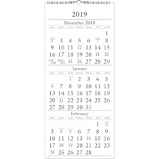 Wall calendar displays three months at a time for thorough planning. Dated planning pages range 14 months from December to January. Monthly wall calendar displays the past, current and future months reference in equal size with large, easy-to-read numbers. Each month includes Sunday-through-Saturday scheduling and holidays. White wire binding has a loop at the top for easy hanging. Calendar pages are printed in rust and gray ink on premium, buff recycled paper.