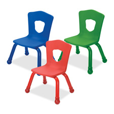 The Brite Kids Chair was designed with both the teacher and student in mind. Steel frame supports from the bottom, allowing an adult weighing up to 300 lb. to use the chair in order to work closely with the students. Plastic boots on the four chair legs protect floor surfaces. Shield-shaped cutouts on the back of the chair allow proper sitting posture and provide a handle for easy mobility. Chairs stack eight high safely.
