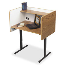 Study carrels provide privacy for a testing area or library. High-pressure laminate finishes blend with room furnishings. White interior provides a bright work area. Top shelf (8" deep) holds books or equipment. Grommet in back panel guides cords for AV equipment. Offers a sturdy black powder-coated steel frame.
