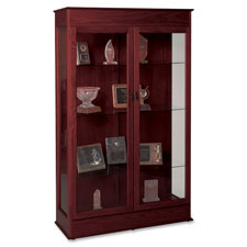 Traditional elegant wood display cases showcase collections, trophies and awards. Wood-framed hinged doors feature a tamperproof lock to secure contents. 3/16" thick tempered glass side and door panels allow viewing from three sides. Three 3/16" thick tempered glass shelves adjust in three positions for different height items. Cornice conceals an inner light to enhance displays.