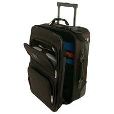 Wheeled carry case features a hidden clothes section for use as overnighter. Well-padded and secure computer compartment is accessible from outside zip pocket. Pocket holds a 15.4" screen laptop. Case includes a removable four-tier file folder section, 43" telescopic handle, large easy-open pullers and rollerblade wheels. Secure with combination lock. Case is fully lined and meets airline size requirements.