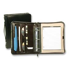 Leather letter-size, zip-around writing case features a shoulder strap and carrying handle attached to spine. Includes 2" removable three-ring binder. Updated organizer for file folder and papers. Slots for media, business cards, and pen. Includes letter-size pad insert for right-handed or left-handed use.