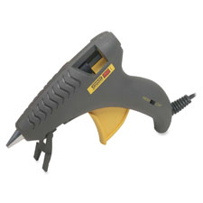 Glue gun features a built-in stand for easy applications and a sleek ergonomic design. Trigger feed mechanism controls glue flow. Adjust the gun with a high/low temperature switch. Glue heats up quickly and bonds in 60 seconds. Glue gun uses dual-temperature glue and weighs 1 lb. (.45 kilos).