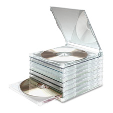 Unique storage systems allow jewel cases to be used individually or stacked to create a custom rack. Cases interlock for stacking and can easily be removed for portability. Each case features a slide-out tray for easy access to CDs or DVDs. Tray locks into place when used as a normal jewel case. Modular design provides unlimited expandability. Jewel cases include labels for each case.