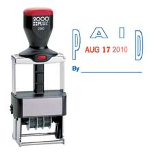 Self-inking classic date features the message, PAID, and the date. Prints blue message with red date. Print area is 1 1/4" x 1 3/16".