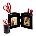 Hinged pencil cup opens to accommodate two 2-1/4" x 3-1/2" photos. Hidden magnets keep cup closed when not in use. Pencil cup holds pens, pencils, scissors and more.