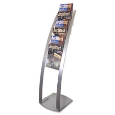 Contemporary floor stand offers six large-capacity compartments for magazine-size materials. Each compartment holds up to 1-5/11". Ideal for reception areas, waiting rooms and trade shows. Open design feature sleek curves, metal frame and plastic pockets.