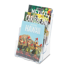 Compact, desktop literature holder features a three-tier design so you can display a variety of brochures. Each pocket displays literature up to 8-1/2" wide. Literature holder is made of crystal-clear plastic. Use as a stand-alone display on countertop or mount on a wall.