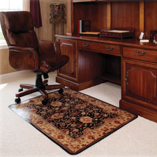 Decorative chairmat is designed and properly weighted for low-pile carpets up to 1/4" thick. Studded back grips the carpet to hold mat in place. Distinct Harbour Pointe design includes rich colors and interior borders to enhance its centralized pattern. Design is applied through a patented process that prevents patterns from being worn over time. Chairmat is made from high quality, 100 percent recyclable vinyl.