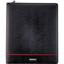 Deco planner features a simulated leather cover with inset stripe, zipper closure and silver zipper pull. Includes undated 12-month calendars, three months of undated weekly planning pages, note pad and telephone/address tabs. Binder features 3/4" capacity rings, business card slots, pen loop, inside front pocket, page marker/ruler and storage pouch.