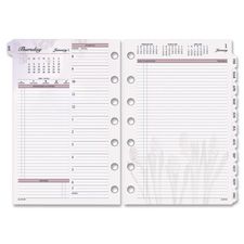 Nature Daily Planning Pages are designed for use with Day Runner Pro Planners. Each quarter offers a different nature design with subtle floral imagery. Dated yearly refill ranges 12 months from January to December. Two-page-per-day spreads feature space for quarter-hourly appointment times from 8 AM to 7 PM, areas for prioritized activities, expense tracking, daily notes and appointments, Julian dates, and past, current and future months reference. Planning pages include monthly overview tabs, an event calendar and four-year overview. Calendar refill is printed on quality paper that contains 60 percent post-consumer material.