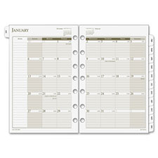 Monthly planner refill makes time management easy for the business professional. Use this dated planner to customize or update your organizer. Dated planning pages range 12 months from January to December. Design facilitates monthly planning of appointments and projects with a quick reference of your scheduled appointments, special dates and recurring events. Perfect for long-term planning. Tabbed, two-page-per-month features ruled daily blocks, Sunday-through-Saturday scheduling, shaded weekends, ruled notes column, count of days/days remaining, holidays and past, current and future months for quick reference. Use the notes area on the left edge to note multi-day events such as business trips, seminars or vacations. Refill is seven-hole punched to fit in three-ring or seven-ring binders and contains a high percentage of post-consumer material.