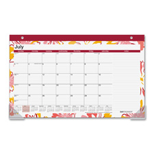 Compact, monthly, desk pad calendar offers feel of the tropics in a beautiful floral design to stay on top of your schedule with warm island style. Floral Explosion academic planning pages range 12 months from July to June. One-page-per-month format includes ruled daily blocks (1-3/4" x 2"), ruled areas for notes, holidays in black ink, Sunday-through-Saturday scheduling, and past and future months reference. Topbound calendar also features two holes in the headband for hanging and clear vinyl corners to hold the monthly sheets in place. Calendar pages are printed with vegetable-based inks on quality recycled paper.