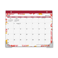 Mini monthly desk pad calendar offers a Floral Explosion background and academic planning for 12 months from July to June. One-page-per-month format includes unruled daily blocks (1-3/4" x 2"), holidays in black ink, Sunday through Saturday scheduling, and past and future months reference. Topbound calendar also features two holes in the headband for hanging, clear vinyl corners to hold the monthly sheets in place, vegetable-based inks, and paper made with 30 percent post-consumer material.