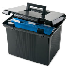 Transport important documents easily with Portable File Boxes. Flip-up handle stays out of way until needed. Lid protects contents when closed. Each box includes three Pendaflex hanging folders, tabs and blank white inserts. Durable, high-impact plastic construction includes a secure latch closure.