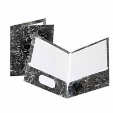 Laminated Two Pocket Folders enhance all kinds of documents from business reports to school assignments. Elegant marble design and high-gloss laminated cover stock complement almost any presentation project. Twin pockets hold numerous 8 1/2" x 11" papers and resist tearing. Personalize your portfolio using the die-cut business card holder.