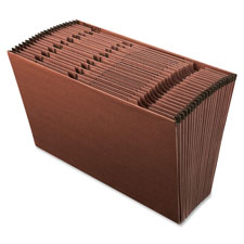 Expanding file is made with a high percentage of recycled material. Red fiber has a leather-look red fiber. The top is open for quick filing and access to filed contents. Convenient preprinted dividers separate papers into easy-to-find categories from A through Z. Reinforced gusset tops prevent bursting and tearing. Expanding file is acid-free.