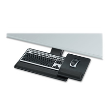 Premium keyboard tray features adjustable height and tilt as well as an adjustable mouse platform. Comfort-Lift system lets you slide the mouse platform left or right over the keyboard numeric pad and offers three custom height positions. Keyboard tray swivels 360 degrees and adjusts in height from 4-1/4" below the track to 1-1/4" above track. Mouse platform tilts forward or backward, adjusts up or down to height of keyboard, and mounts on left or right side of keyboard. Warning Trak helps prevent the mouse from sliding off the mousing platform. Loosen single knob to adjust tray height and tilt (negative 10 degrees), and then retighten the knob to lock in position. Soothing memory foam wrist places the hand/wrist in a neutral position and features Microban antimicrobial protection so the keyboard tray stays cleaner. Platform measures 19" wide x 10-5/8" deep.
