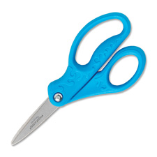 Classic 5" kids pointed scissors feature a handle made from 100 percent post-consumer recycled plastic. Stainless steel blades are corrosion-resistant. Scissors are designed for use with left-handed or right-handed users and for ages 6 and up.