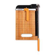 Eco-friendly bypass trimmer quickly trims large quantities of a variety of materials. Ideal for heavy use. Trimmer cuts 15 sheets of 20 lb. paper at a time. Durable base is made from a naturally renewable, fast-growing bamboo. The titanium-coated, self-sharpening blade will never need replacing. Innovative fingerguard and automatic paper clamp enable safe and secure cutting. A printed grid helps ensure cutting precision. Built-in handle makes carrying easy.