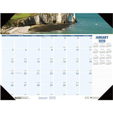Desk pad offers a full-color photo of a different coastline on each month. Dated planning pages range 12 months from January to December. One-page-per-month format includes unruled daily blocks, Sunday-through-Saturday scheduling, ruled notes section, count of days/days remaining, holidays, and a full-year calendar reference. Nonrefillable desk pad has four reinforced leatherette corners to secure the calendar pages. Paper is made with a high percentage of recycled material.