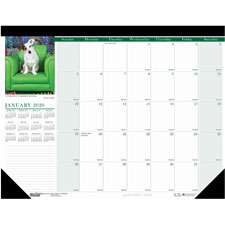 Monthly desk pad offers a color picture of puppies and a fun quotation on every page. The one-page-per-day format features unruled daily blocks (2-1/4" x 2-7/8"), shaded weekends, days remaining, ruled section for notes on the left, Sunday-through-Saturday scheduling, count of days/days remaining, holidays and a full-year calendar reference above the notes area. Dated planning pages range 12 months from January to December and are bound and perforated at the top for easy tear-out. Desk pad also includes black, reinforced leatherette corners and binding. Pad is made with a high percentage of recycled material.