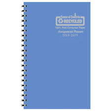Wirebound weekly planner features a two-piece leatherette cover and academic format. Dated planning pages range 13 months from August to August. Two-page-per-week spreads include ruled daily entries, count of days/days remaining, Monday-through-Sunday scheduling, and past, current and two future months reference. Monthly planning section offers two-page-per-month calendars from August to August. Each monthly spread has unruled daily blocks and Sunday-through-Saturday scheduling. Planner is printed with soy ink on paper made with a high percentage of recycled material.
