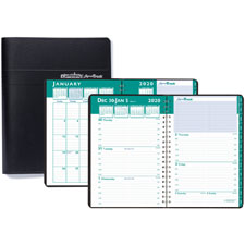 Weekly/monthly planner offers Life Management Tips for prioritizing goals and Express Track notes space on each spread. Dated planning pages range 13 months from January to January. Weeks are numbered. Two-page-per-week spreads include ruled daily entries with hourly appointments, Monday-through-Sunday scheduling, days remaining, and four months reference. Two-page-per-month spreads offer ruled daily blocks, Sunday-through-Saturday scheduling, count of days/days remaining, holidays and five months reference. Nonrefillable planner also features two-color graphics (teal and blue), tabbed monthly index for express finding, wire binding, and an embossed simulated leather cover. Tabs are die-cut. Paper is made with a high percentage of recycled material and printed with soy ink.