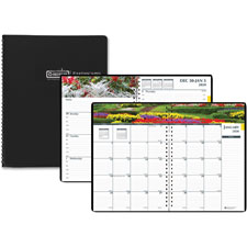 Weekly/monthly planner features a colorful garden photo on each spread. Dated planning pages range 12 months from January to December. Weeks are numbered. Two-page-per-week spreads include ruled daily entries, hourly appointment times from 8 AM to 5 PM, Monday-through-Sunday scheduling, count of days/days remaining, holidays and three months reference. Two-page-per-month spreads include ruled daily blocks, holidays and Sunday-through-Saturday scheduling. Printed monthly indicators make it easy to find a specific date. Nonrefillable planner also features wire binding and a suede-like cover. Paper is made with a high percentage of recycled material and printed with soy ink.