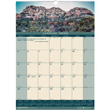 Wall calendar features a full-color photo of landscapes and an inspirational quote on each month. Dated planning pages range 12 months from January to December. One-page-per-month format includes unruled daily blocks, Sunday-through-Saturday scheduling, count of days/days remaining, shaded weekends, holidays, and full-year calendar reference at bottom. Calendar is wirebound with an eyelet for hanging. Heavy, 70 lb. cream-colored paper is printed with soy ink and made with a high percentage of recycled material.