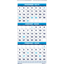 Three-month calendar offers large, bold numerals and three months of dated planning on each page so you can refer to the past month, current month and one future month at a glance. 14 months of planning range from December to January. Each page offers holidays numbered in a lighter shade, unruled daily blocks (1-5/8" x 1-3/8"), and full-year calendar reference along the bottom. Calendar is wirebound with an eyelet for hanging and is printed on paper made with a high percentage of recycled material.