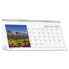 Tent calendar offers an easy way to keep advanced planning at your fingertips. Calendar sets up easily on your desktop or countertop. Spiral binding at the top provides quick access to future and past months. Each month features a 12-month reference calendar on the reverse side. Two-page-per-month spreads also include unruled daily blocks, Sunday-through-Saturday scheduling, and a full-color photo. Planning pages range 12 months from January to December. Paper is made with a high percentage of recycled material.