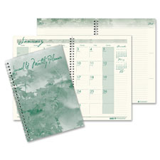 Monthly wirebound journal features a laminated hardcover and 12 months of dated planning pages from January to December. One-page-per-month format includes ruled daily blocks (1-3/8" x 1-3/4"), Sunday-through-Saturday scheduling, ruled notes area, count of days/days remaining, holidays, and past and future months reference. Weeks are numbered. Nonrefillable monthly journal also contains 100 ruled journal pages. Cream paper is printed with green ink.