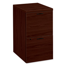 Mobile pedestal features two file drawers and a woodgrain laminate finish. Each file drawer stores letter-size and legal-size files (sold separately). Hangrails are provided in all file drawers for side-to-side, letter-size and legal-size filing; and front-to-back for letter-size filing. Both locking file drawers have HON "One Key" interchangeable core-removable lock and hangrails for hanging folders. Drawers operate on ball-bearing suspension with full extension. Use pedestal freestanding or under 29-1/2" high workstations. Adjustable hex leveling glides with a 3/4" adjustable range allow the pedestal to be easily leveled without lifting the unit. Pedestal is certified by SCS to be in compliance with specific indoor air-quality emission requirements and meets or exceeds applicable ANSI/BIFMA standards.