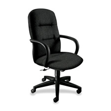 Executive high-back chair features exceptional quality visco-elastic memory foam in the seat cushion that reduces pressure points and responds to contours of the body for lasting comfort over extended-use periods. Functions include tilt, tilt tension, tilt lock, 360-degree swivel and pneumatic seat-height adjustment. Design features 2-1/2" thick urethane foam cushion with 1-1/2" thick visco-elastic foam topper, 2" thick urethane foam cushion over 1/2" thick five-ply plywood on back, fully upholstered outer back and urethane loop arms with steel inner structure. Five-star base has 2" hooded dual-wheel casters. Chair is available in black frame only. Certified by SCS to be in compliance with specific indoor air-quality emission requirements. Meets or exceeds applicable ANSI/BIFMA standards.