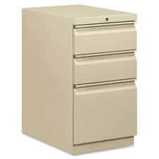 Brigade Series Pedestal with R-pull design fits under standard HON Initiate, 38000 Series and worksurfaces. Each box drawer has one drawer divider and a pencil tray. Each file drawer has two crossrails. File drawer has high sides for filing front-to-back. Pedestal offers ball-bearing suspension on the file drawer (90 percent extension), and roller suspension on two box drawers (75 percent extension). Pedestal is equipped with HON One Key interchangeable core removable locks, fixed front casters and swivel rear casters. Counterweight inhibits tipping when opening more than one drawer. Pedestal meets or exceeds ANSI/BIFMA and ISTA performance standards.