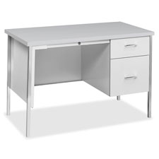 Steel desks feature a central locking center drawer, chrome steel legs, a 3/4 extension box drawer with one divider standard and 3/4 height modesty panels. The high-sided file drawer is designed for hanging file folders. "Tru-fit" mitered drawer fronts for better visual alignment. Central locking center drawer standard, with HON "One Key" interchangeable lock cores. Keyed-alike cores ordered separately. Full extension triple-tied cradles on all file drawers for full access. High-sided file drawers accept hanging files without hangrails. Spring-loaded, follower blocks standard. Sound-absorbing material for quiet drawer operation. Reinforced, double "O" frame inner structure keeps desk solid and sturdy for years of use. Chrome legs shipped unattached. Meets or exceeds ANSI/BIFMA and ISTA performance standards.