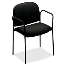 Multipurpose chairs offer contemporary tubular arms and a frame with upholstered outer back. Comfortable cushions provide thick padding. Chairs stack five high and are available in black frame only. Certified by SCS to be in compliance with specific indoor air-quality emission requirements, chairs meet or exceed applicable ANSI/BIFMA standards.