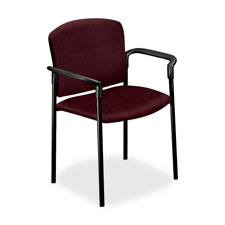 Stacking guest chairs stack up to five high for use in meeting rooms, conference areas, cafeterias and reception areas. Molded seat underpans protect seat fabric when stacked and give a finished appearance. 20-1/4" wide x 19-3/4" deep seat is made with a compound-curved, blow-molded plastic and a 3" thick urethane foam cushion. Usable seat depth is 16-3/4". Seat from floor height is 18". Inverted U construction with 1" 14-gauge steel tubing runs through polymer arm caps for exceptional rigidity. Guest chairs have fully upholstered fan backs that measure 21-1/4" wide and 16-1/4" high. Polymer arm caps have gently sloping, wide top surfaces for maximum comfort. Upholstery is made with 50 percent polyester and 50 percent acrylic fabric with fabric protector. Chair is available in black frame only. Certified by SCS to be in compliance with specific indoor air-quality emission requirements. Meets or exceeds applicable ANSI/BIFMA standards.