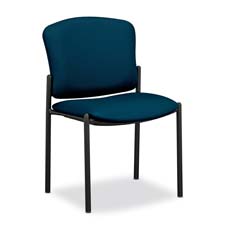 Armless guest chairs stack up to five high. Use in meeting rooms, conference areas, cafeterias and reception areas. 20-1/4" wide x 19-3/4" deep seat and 21-1/4" wide x 16-1/4" high back are fully upholstered for comfort. Molded seat underpans protect seat fabric when stacked and give a finished appearance. Usable seat depth is 16-3/4". Seat from floor height is 18". Inverted U construction features 1" 12-gauge steel tubing that runs through polymer arm caps for exceptional rigidity. Upholstery is made with 50 percent polyester and 50 percent acrylic fabric with fabric protector. Chair is available in black frame only. Certified by SCS to be in compliance with specific indoor air quality emission requirements. Meets or exceeds applicable ANSI/BIFMA standards.