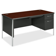 Mentor Single Pedestal Steel Desk features radius leg design, arched drawer pulls, 3/4" height modesty panels and rounded edge desktop with soft feel-vinyl edge. Desk offers wire management grommets, 13-1/2" deep, central locking center drawer with HON "One Key" interchangeable lock cores. Keyed alike cores must be ordered separately. High-sided file drawers accept hanging files without hangrails. Spring-loaded, follower blocks are adjustable on 5/8" centers. 3/4 extension box drawers with one divider provide 21" deep filing capacity. Sound-absorbing material allows quiet drawer operation. Reinforced double "O" frame inner structure keeps desk solid and sturdy for years of use. Full-extension triple-tied cradles on all file drawers provide 21" deep filing capacity. Vinyl edge and painted leg matches specified chassis color. All interior drawer bodies are made of painted steel. Meets or exceeds ANSI/BIFMA and ISTA performance standards.