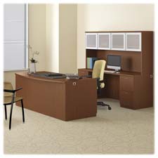Park Avenue Laminate Collection offers an upscale design with clean, uninterrupted lines, tri-oval edge detail, vertically matched woodgrain and mixed materials. Tops are easy-care abrasion resistant and spill-resistant thermal-fused laminate over durable, 1-1/8" thick, solid-core, high-performance particleboard. Contemporary options include frosted doors and modesty panels with nickel trim. Full-to-the-floor pedestals maximize storage space. Removable media organizer in middle drawer. Spacious file drawers store letter-size or legal-size folders. Pencil tray helps organize the top supplies drawer. Cord management grommets facilitate routing and hiding wires/cables and reaching wall outlets. Precision ball-bearing suspension delivers smooth, quiet, long-lasting operation. Furniture is certified by SCS to be in compliance with specific indoor air quality emission requirements. Meets or exceeds applicable ANSI/BIFMA and ISTA performance standards.