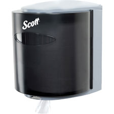 Center-Pull Towel Dispenser offers roll control so you pull off a towel from any angle with minimized roping and streaming. Hands touch only the towel used. Design allows easy, one-handed loading. Patent-pending, "dynamic throat" technology reduces dispensing problems. Towels are used with Kimberly-Clark center-pull systems that reduce dispensing problems and provide more hand dries per case. Towel dispenser holds Kimberly-Clark Scott Roll Control Center-pull Towels with patented absorbency pockets.