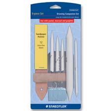 Drawing companion set includes sandpaper lead pointer, kneadable art eraser, erasing shield, three paper stumps, two tortillions, and 3" x 3" chamois. Soft and pliable rubber eraser can be kneaded into any shape and is ideal for highlighting chalks, charcoals, pastels, and for cleaning artwork and film. Erasing shield is a valuable aid in precise erasing of particular sections, lines, dots, or curves, while protecting the rest of the drawing. Shield is made of flexible stainless steel and has a matte finish.
