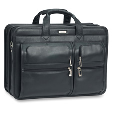 Leather laptop portfolio features a padded laptop pocket that holds most 15.4" laptops. Exterior front pockets offer easy access to PDA, USB stick, MP3 player or other accessories. Back compartment contains a two-section accordion fan file. Laptop case also has a removable, adjustable shoulder strap and cushioned carry handles.